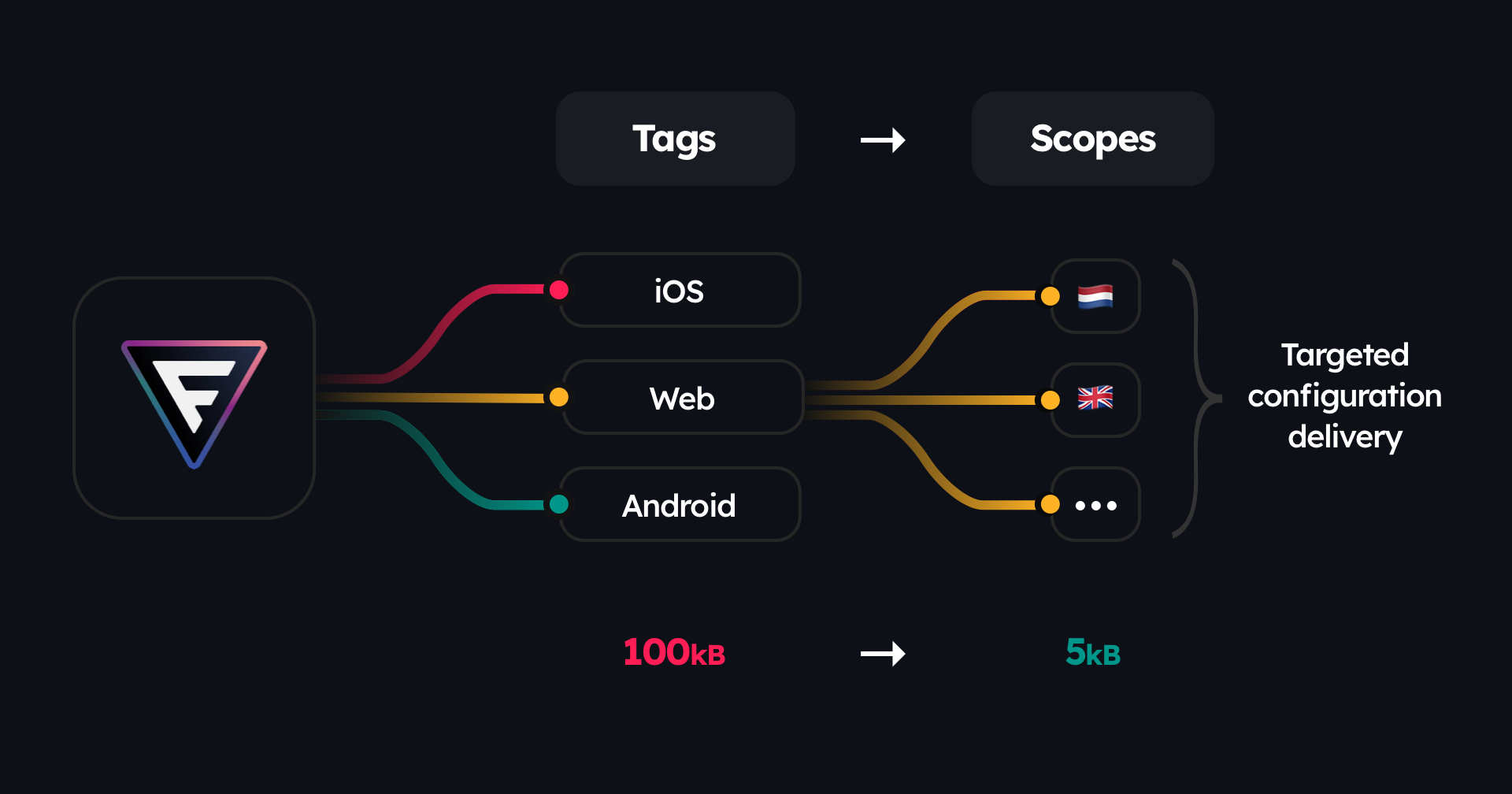 module.exports = { environments: [ "production", ], tags: [ "web", "ios", "android", ], scopes: [ // we are letting Featurevisor know to // create a new scoped datafile // by picking features tagged with `web` // and removing redundant rules that do not matter // after applying the partially known context `{ platform: "web" }` { name: "browsers", tag: "web", context: { platform: "web" }, }, ],}What's happening above is, we are letting Featurevisor know to: