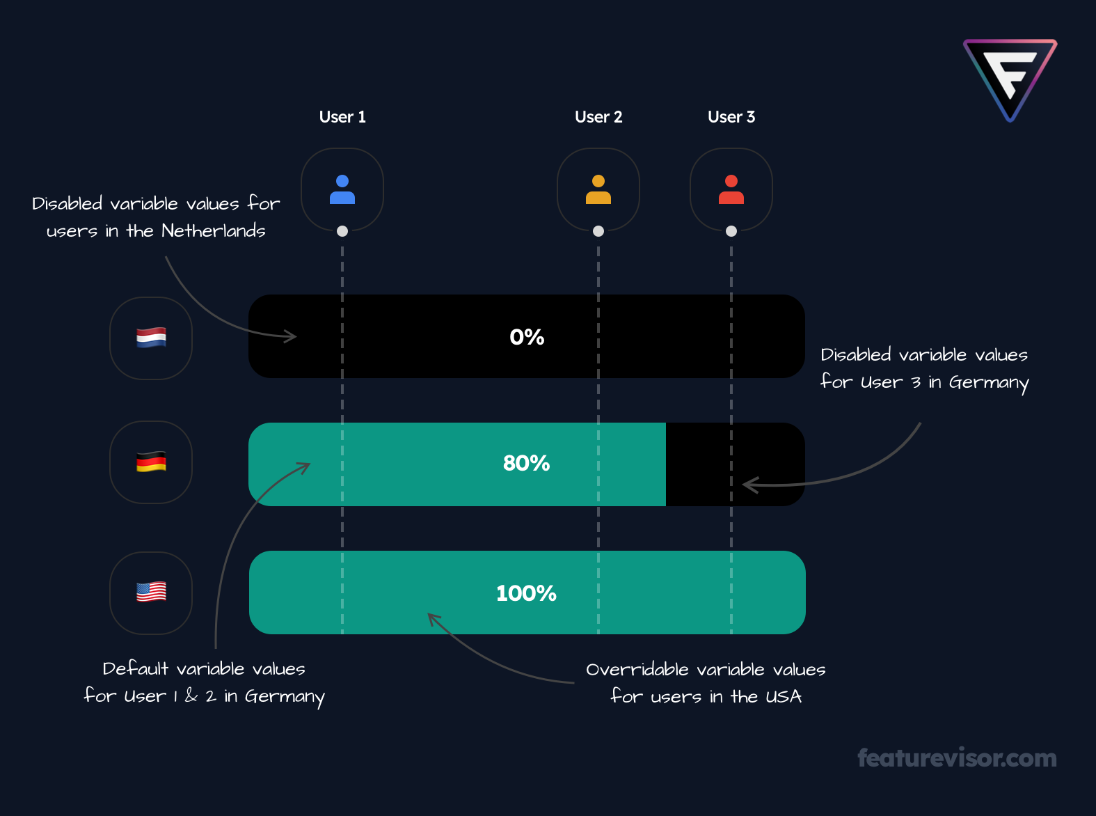 # ...rules: production: - key: nl segments: netherlands percentage: 0 - key: de segments: germany percentage: 80 - key: us segments: usa percentage: 100 variables: my_variable: different value for USAOverrides at variation level#